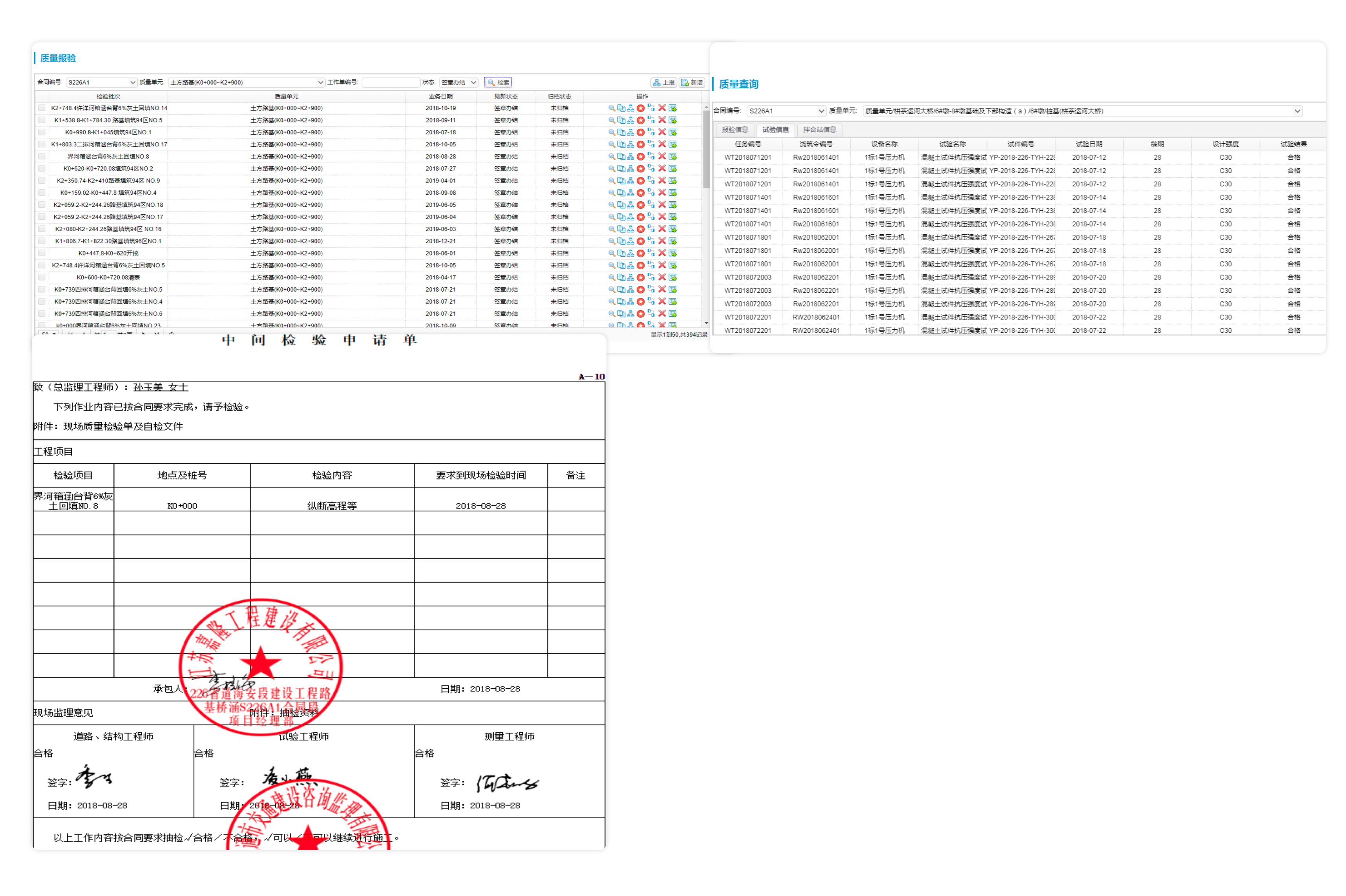 質(zhì)量管理業(yè)務(wù)全鏈打通,質(zhì)量報驗關(guān)聯(lián)拌合生產(chǎn)、試驗檢測、張拉壓漿等全面數(shù)字化。